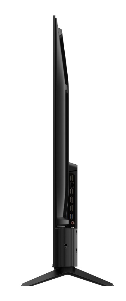 Телевизор оснащен двумя динамиками суммарной мощностью 30 Вт с поддержкой Dolby Audio. Дизайн модели сочетает металлический безрамочный корпус и ультратонкие рамки толщиной 5.7 мм. Подставка расположена по бокам, крепление VESA 300×300 мм. Класс энергоэффективности A, максимальная потребляемая мощность 200 Вт.